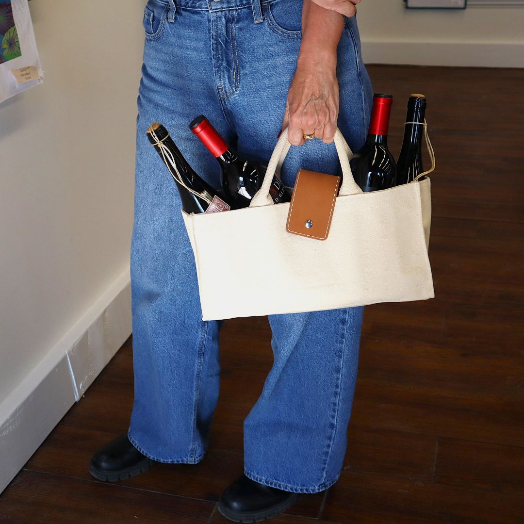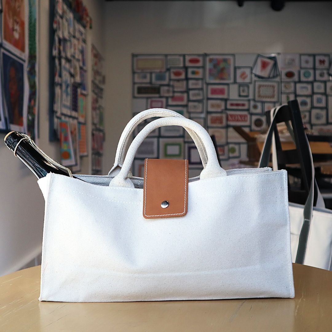 Our Wine Tote is made of heavyweight cotton canvas with a leather tab closure and woven handles.